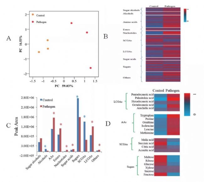 得到了456個(gè)高質(zhì)量的特征峰,病原侵染組與對照組間代謝物存在顯著差異,其中醇、短鏈有機(jī)酸(SCOA)和糖在病原處理組中的含量顯著降低,而氨基酸和長鏈有機(jī)酸(LCOAs)的含量則顯著增加。