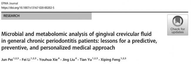 文章標(biāo)題:Microbial and metabolomics analysis of gingival crevicular fluid in general chronic periodontitis patients: lessons for a predictive, preventive, and personalized medical approach