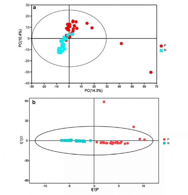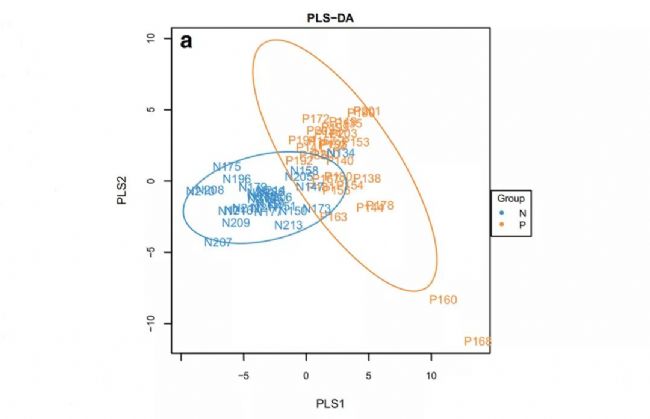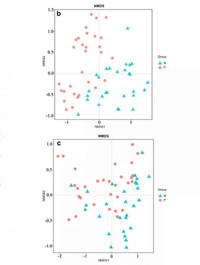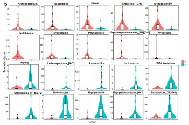 圖3. 通過Metastats對GCP患者(P組)和健康對照組(N組)在門(a)和屬(b)水平上的分類單元豐度進(jìn)行統(tǒng)計(jì)比較
