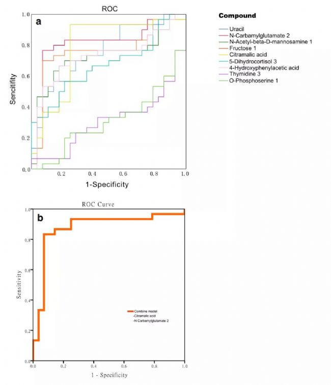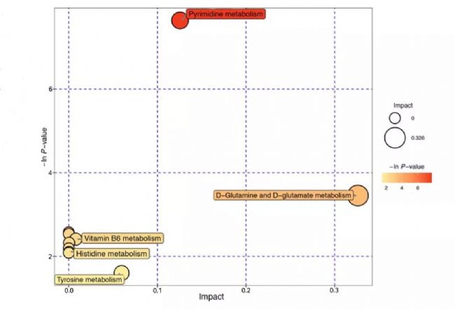去除內(nèi)標(biāo)物和假陽性峰,合并同一代謝物的峰后,共獲得147個(gè)定性代謝物。與對照組相比,牙周病患者表現(xiàn)出明顯的代謝改變。與健康對照組相比,牙周病患者的GCF代謝物差異最大。為了進(jìn)一步表征代謝物的特征,我們進(jìn)行了代謝物集富集分析(MSEA)和拓?fù)浞治,在牙周病組中,嘧啶代謝、D-谷氨酰胺和d-谷氨酰胺代謝被確定為顯著過度表達(dá)的途徑(分別為p=0.000488027和0.031594),這可能反映了疾病相關(guān)社區(qū)的代謝特征。