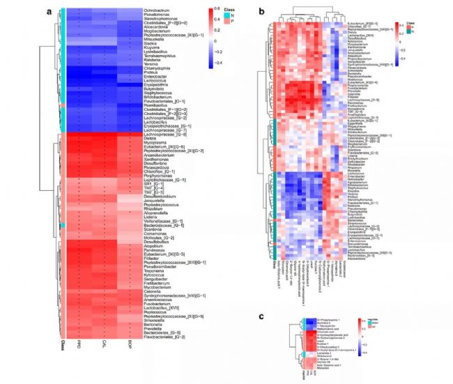 5.微生物群、代謝物和牙周臨床指標(biāo)之間的相關(guān)性