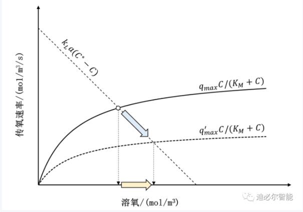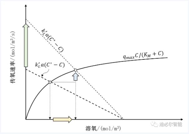 圖2b 在傳質系數(shù)一定的情況下,微生物細胞代謝狀態(tài)對溶氧濃度和傳質速率的影響。藍色箭頭表示耗氧量的下降,黃色箭頭表示溶氧濃度的增加[1]