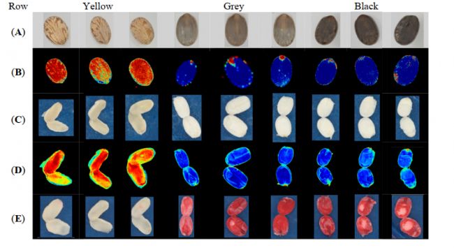 本文是對(duì)蓖麻的第一項(xiàng)研究,其中使用多光譜成像測(cè)量了種皮顏色反射,并根據(jù)種子活力進(jìn)行了分類。Lucena 等人實(shí)施了類似的蓖麻種子分離,基于人眼的檢查,在我們的研究中也進(jìn)行了評(píng)估作為主要步驟(A 行,圖 2)。圖 2 提供了生態(tài)型 Esfahan 種子的概覽,分為三個(gè)種皮顏色類別;黃色、灰色和黑色。行A中種子的3×3圖像的視覺(jué)比較表明所有三種種皮顏色類別之間的顏色變化。B行顯示A行種子的變換圖像;此處黃色種子顯示為紅色,灰色和黑色種子顯示為藍(lán)色。C行和D行顯示切割的種子,觀察到與整個(gè)種子相似的模式,展示了圖像的轉(zhuǎn)換如何導(dǎo)致切割的黃色種子呈現(xiàn)紅色,而可行的切割種子呈現(xiàn)藍(lán)色外觀。E行顯示四唑染色的結(jié)果。根據(jù)脫氫酶活性,黃色種子沒(méi)有染色,而灰色和黑色種子將活組織染成紅色。因此,我們的結(jié)果表明,多光譜成像可以是蓖麻種子活力測(cè)試中的一種非破壞性方法,因?yàn)槲覀円呀?jīng)觀察到種皮顏色反射與通過(guò)四唑測(cè)試獲得的活力之間令人滿意的正相關(guān)。