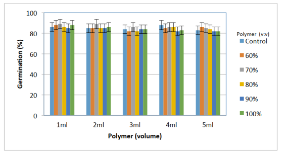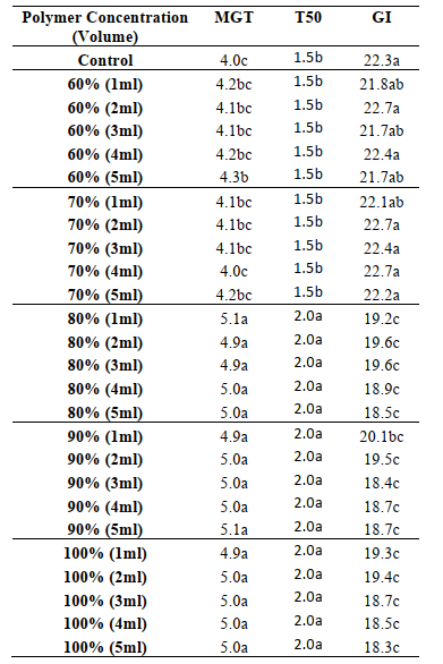 涂有60%和70%聚合物的種子與對照(表2)具有相似的發(fā)芽率(MGT≈4.0,T50≈1.5 和 GI≈22.2)。然而與對照相比,用較高聚合物濃度(80、90和100%)包衣的種子具有較低的發(fā)芽率(MGT>4.0,T50>1.5 和 GI<22.2)。這表明發(fā)芽率受涂層覆蓋率的影響。較低的發(fā)芽率可能是由于高濃度的聚合物在種子表面形成一層較厚的涂層,從而減慢了水分的吸收。