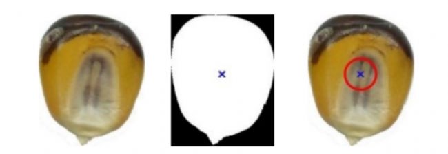 確定在對數(shù)據(jù)集中隨機(jī)選擇的80粒玉米種子進(jìn)行的測量中,統(tǒng)計學(xué)上的35像素半徑代表胚孔。圖2顯示了二倍體玉米種子樣本的種子質(zhì)心和特征提取區(qū)域。