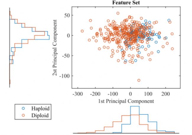 總共使用了48個紋理特征來表示數(shù)據(jù)集中的每個圖像。帶有邊緣直方圖的數(shù)據(jù)集中樣本的分布如圖4所示。單倍體樣本用藍(lán)色強(qiáng)調(diào),而二倍體樣本用橙色突出顯示?梢钥闯,單倍體和二倍體標(biāo)本是交織在一起的。這意味著將解決具有挑戰(zhàn)性的分類任務(wù)。