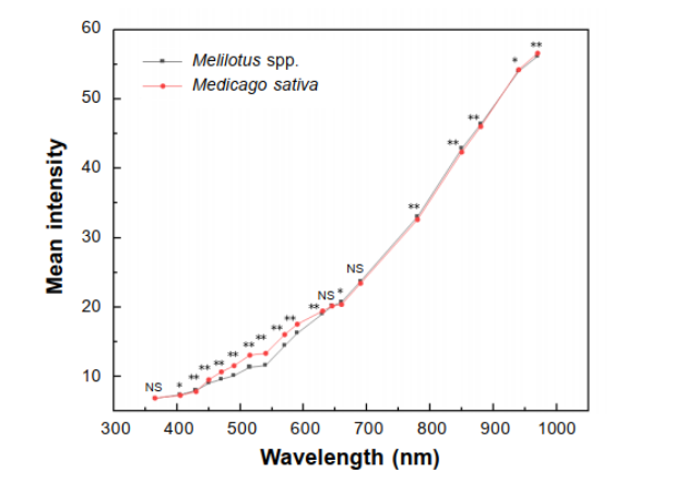 苜蓿和苜蓿的種子具有顯著不同的光反射模式。一般來說,在405到430nm和660到880nm的光譜范圍內(nèi),在Melilotus spp 中觀察到顯著更高的反射率值。種子與苜蓿種子相比。然而,在450至630nm和940至970nm波長(zhǎng)范圍內(nèi),觀察到相反的趨勢(shì),與苜蓿種子相比,苜蓿種子具有顯著更高的反射強(qiáng)度。