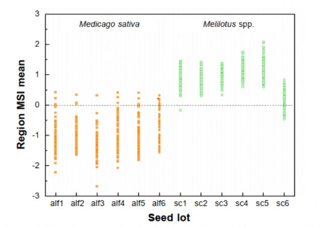 圖2.苜蓿和苜蓿屬植物的預(yù)測(cè);趶膎CDA轉(zhuǎn)換圖像計(jì)算的區(qū)域MSI平均值的數(shù)據(jù)集