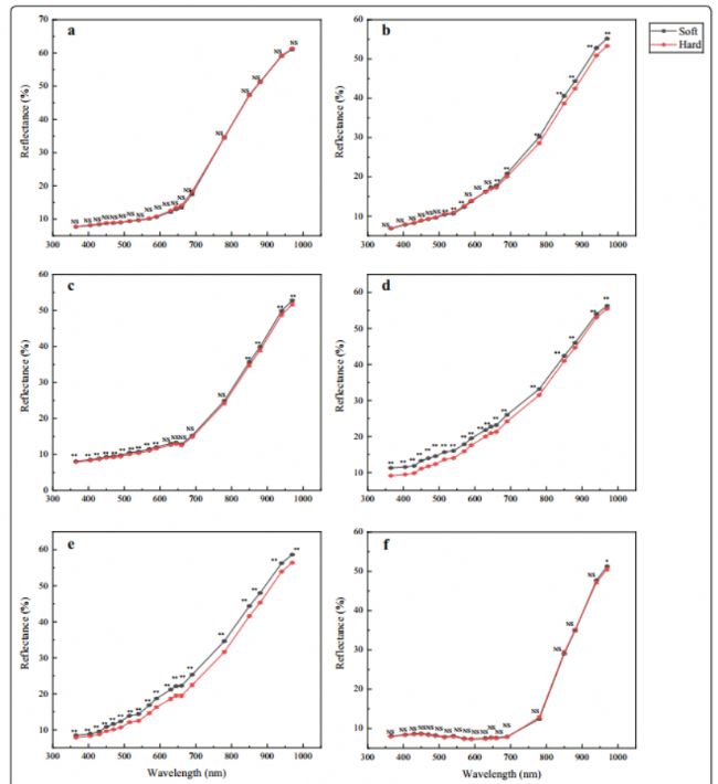 圖2.硬種子和軟種子中19個波長(nm)的平均光反射率
