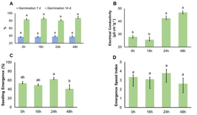 7天和14天的標(biāo)準(zhǔn)發(fā)芽試驗(yàn)沒(méi)有表明種子類別之間的統(tǒng)計(jì)差異(圖 2A)。然而,電導(dǎo)率測(cè)試表明,陳化24和48小時(shí)的種子類別的值高于陳化0和16小時(shí)的種子(圖2B)。較高的電導(dǎo)率與細(xì)胞膜的退化反應(yīng)有關(guān),因此會(huì)降低種子活力(BARBOZA DA SILVA 等人,2013 年)。此外,對(duì)膜造成的損害導(dǎo)致從老化48小時(shí)的種子生長(zhǎng)的幼苗出苗率較低(圖 2C),盡管處理之間的出苗速度指數(shù)相似(圖2D)。盡管標(biāo)準(zhǔn)發(fā)芽試驗(yàn)的靈敏度不足以檢測(cè)類別之間的差異(圖2A),但葉綠素?zé)晒饧夹g(shù)可以區(qū)分不同活力水平的種子,其中活力較高的種子(0小時(shí))顯示出較高的葉綠素?zé)晒庵礱和b(圖3A、B)。
