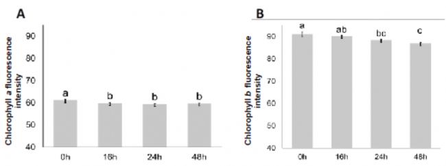 圖3.(A)葉綠素a激發(fā)/發(fā)射組合630/700nm 的熒光;(B)葉綠素b熒光在405/600 nm的激發(fā)/發(fā)射組合下
