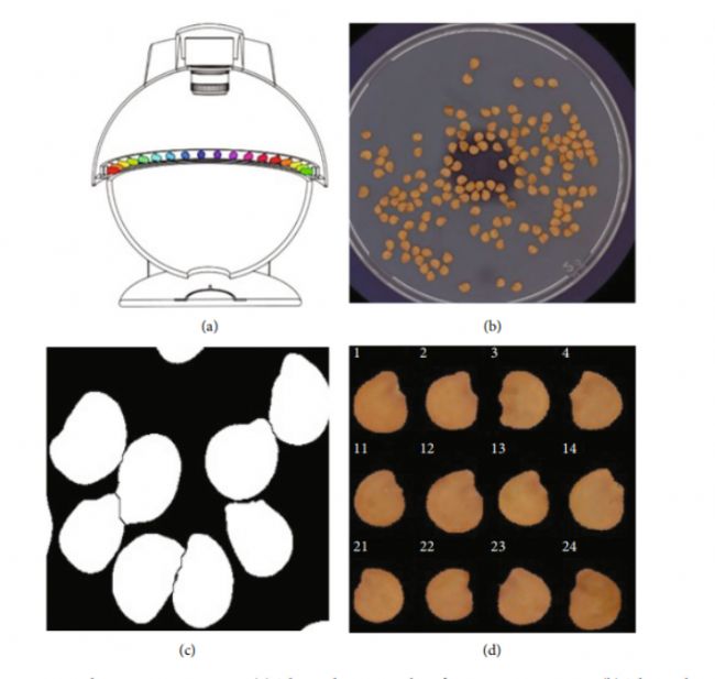 圖1.圖像采集和圖像分割。(a) VideometerLab4用于圖像采集。(b) 茄子種子的多光譜圖像(查看模式:sRGB)。(c) 分水嶺算法分割的種子邊界圖像。(d)單個種子的圖像。
