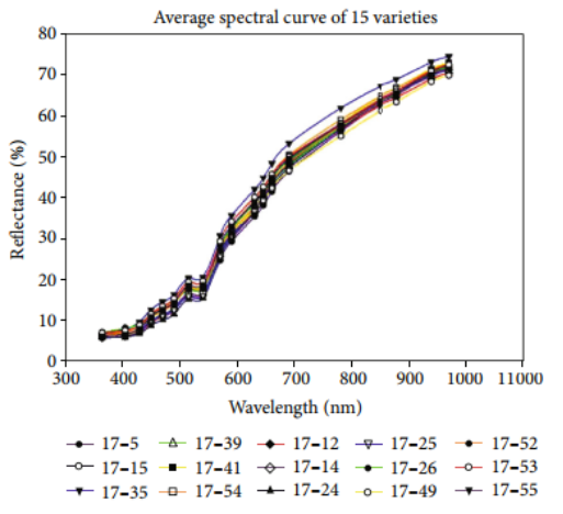 圖3.十五種茄子種子的平均反射率