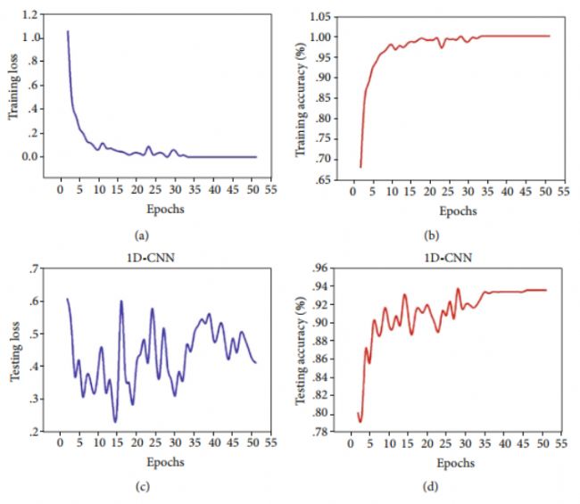 使用SVM和1D-CNN 開發(fā)了基于提取特征的判別模型。RBF、poly 和線性核函數(shù)用于SVM。具有線性核函數(shù)的SVM算法的最佳精度為91.28%。表現(xiàn)最好的模型是CNN,分類準(zhǔn)確率為94.80%。圖 2(a)–4(d) 顯示了訓(xùn)練損失、訓(xùn)練準(zhǔn)確度、測試損失和測試準(zhǔn)確度。損失隨著迭代而急劇下降,而分類精度迅速提高,這表明快速收斂。