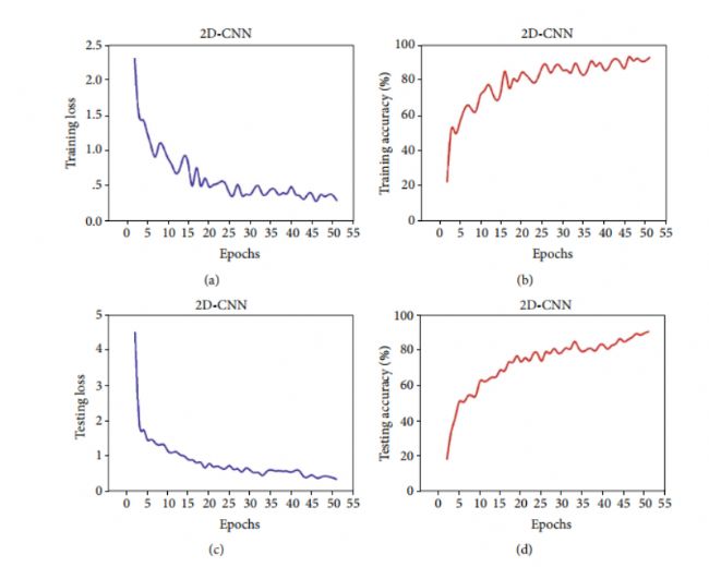 圖3.2D-CNN 的曲線:(a)訓(xùn)練損失;(b) 訓(xùn)練準(zhǔn)確性;(c) 測試損失;(d) 測試精度