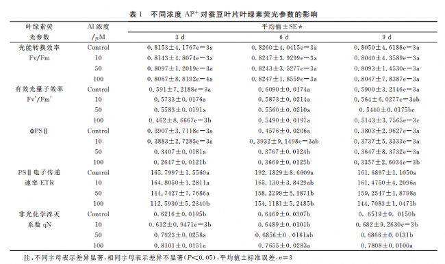 試驗(yàn)結(jié)果:對照組及鋁處理組葉片的Fv/Fm 值無顯著性差異(P>0.05)。各 Al3+ 處理組與對照組葉片的Fv/Fm值在 0.80~0.83 之 間,屬 正 常 范 圍。100μM Al3+處理3d的蠶豆幼 苗 葉 片 中Fv’/Fm’值 降 低,與 對 照 組 及 10μM、50μM處理 組相比差異顯著(P<0.05)。6d后,盡管各 Al3+處理組與對照組的 Fv’/Fm’值無顯著差異(P>0.05),但Al3+處理組 Fv’/Fm’值低于對照組。50μM 和100μM Al3+ 處理9d后,幼苗葉片中的Fv’/Fm’值比對照組顯著降低(P<0.05)(表1)。