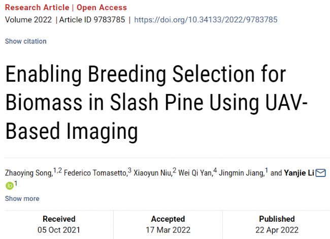 近日,Plant Phenomics 在線發(fā)表了中國(guó)林業(yè)科學(xué)研究院亞熱帶林業(yè)研究所林木種質(zhì)資源研究組題為 Enabling Breeding Selection for Biomass in Slash Pine Using UAV-Based Imaging 的研究論文,提出了利用無(wú)人機(jī)圖像技術(shù)推動(dòng)林木常規(guī)遺傳育種進(jìn)程,助力濕地松高固碳良種選育。