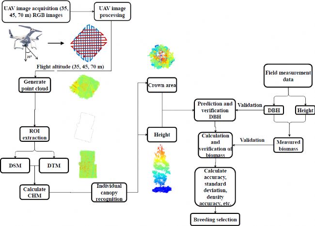 目前,專門針對(duì)濕地松固碳表型數(shù)字化育種研究仍較少,林木生物量與其碳匯能力關(guān)系密切,而傳統(tǒng)林木生物量測(cè)量耗時(shí)、耗力,在實(shí)際林木遺傳育種工作中作用較為有限,因此,本研究以重要碳匯樹種濕地松為試驗(yàn)材料,以固碳樹種良種化提升為出發(fā)點(diǎn),圍繞數(shù)字化育種,開發(fā)和比較了基于無(wú)人機(jī)RGB成像技術(shù)的濕地松外在形態(tài)和生物量相關(guān)指標(biāo)的高通量、快速測(cè)量方法,使用無(wú)人機(jī)成像獲取的濕地松固碳相關(guān)指標(biāo)進(jìn)行了遺傳參數(shù)估算,深度解析了濕地松生物量相關(guān)表型的遺傳變異規(guī)律,并對(duì)比了無(wú)人機(jī)數(shù)據(jù)與實(shí)際測(cè)量數(shù)據(jù)的準(zhǔn)確性。結(jié)果表明,無(wú)人機(jī)RGB成像技術(shù)能夠以最高85%的準(zhǔn)確率實(shí)現(xiàn)濕地松樹高、胸徑、冠幅、地上和地下生物量的高通量、快速預(yù)測(cè)。無(wú)人機(jī)獲取的所有性狀取得了與地面實(shí)際測(cè)量性狀相似的遺傳增益,所有性狀的遺傳力(h2)范圍在0.13-0.47,遺傳差異顯著, 本研究成功篩選出優(yōu)良的濕地松高固碳良種,該研究提出的方法為推動(dòng)林木從“試驗(yàn)選優(yōu)”的傳統(tǒng)常規(guī)育種向“計(jì)算選優(yōu)”智能化育種的轉(zhuǎn)變,縮短育種周期,實(shí)現(xiàn)林木遺傳育種數(shù)字化等方面提供了良好技術(shù)支撐。