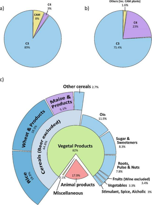 圖2.(A) CAM、C4 和C3植物在250,000 種陸生植物中的分布和(B)它們各自對(duì)全球初級(jí)生產(chǎn)總值(GPP) 的貢獻(xiàn)。(C)全球膳食能量供應(yīng)的比例,不同物種提供的千卡/人/天