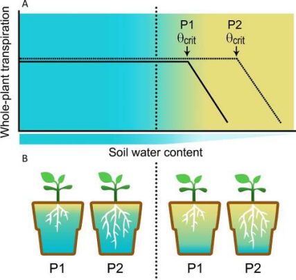 最近發(fā)表的一篇文章描述了一個(gè)FPP,該FPP已經(jīng)建立起來(lái),與一個(gè)用于確定土壤含水量成為植物蒸騰限制因子的臨界θ(Ɵcrit)點(diǎn)的模型一起工作。Ɵcrit是確定植物水分平衡行為的一個(gè)重要參數(shù),根系充分利用任何可用水分的能力可能是Ɵcrit的一個(gè)重要組成部分。因此,在具有相似大小嫩枝和相似蒸騰水平的植物中,那些具有更好根系表現(xiàn)能力(這可能是根系結(jié)構(gòu)、解剖和/或生化或生理機(jī)制的結(jié)果)的植物將表現(xiàn)出較低的Ɵcrit值。也就是說(shuō),具有優(yōu)良根系性能的植物能夠在干燥的土壤中保持正常的蒸騰速率(見(jiàn)圖3)。