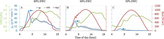 據(jù)報(bào)道,許多作物品種的以下生理參數(shù)與產(chǎn)量高度相關(guān):氣孔導(dǎo)度、水力導(dǎo)度、生長(zhǎng)速率、不等水行為、有效水分利用率、膜穩(wěn)定性指數(shù)(MSI)、總?cè)~綠素含量,午間水勢(shì)低,午間相對(duì)含水量低,蒸騰限制性狀(TRlim)。這些動(dòng)態(tài)特征受到環(huán)境條件自然變化的影響。即使在灌溉良好的條件下,光照和VPD的自然日變化也會(huì)對(duì)某些作物產(chǎn)生重大影響。氣孔導(dǎo)度和蒸騰速率等重要性狀(如圖5所示)。事實(shí)上,F(xiàn)PP可以用來(lái)連續(xù)測(cè)量這些性狀(見(jiàn)表3)并同時(shí)比較許多植物,這使我們能夠在一天中的某些時(shí)段檢測(cè)到對(duì)環(huán)境變化的反應(yīng)的微小變化。這些變化在不同植物中發(fā)生的方式上的微小差異,如果每天重復(fù)發(fā)生,可能會(huì)對(duì)季節(jié)性生產(chǎn)產(chǎn)生顯著的累積效應(yīng)。此外,通過(guò)對(duì)目前已鑒定的數(shù)量生理性狀的測(cè)定,我們認(rèn)為開(kāi)發(fā)和獲取新的有益生理性狀是非常重要的。即使在逆境條件下,一個(gè)具有提高植物生產(chǎn)力潛力的生理特性的例子就是“氣孔導(dǎo)度黃金時(shí)刻”。每日氣孔導(dǎo)度模式包括一個(gè)清晨高峰。隨著VPD的增加,這一數(shù)字會(huì)下降,并在上午晚些時(shí)候和中午達(dá)到穩(wěn)定狀態(tài)。這種行為被認(rèn)為是使高二氧化碳吸收,而蒸騰作用是非常低的,由于相對(duì)較低的VPD。為了證明這一黃金時(shí)刻,我們連續(xù)監(jiān)測(cè)了全株氣孔導(dǎo)度、光照強(qiáng)度、VPD和蒸騰作用(圖5)。在水分充足的條件下,隨著溫室內(nèi)光照的增加,氣孔導(dǎo)度迅速增加,并不斷增加,直至達(dá)到最大值∼07:30(圖5A)。在這段時(shí)間里,VPD非常低,事實(shí)上與夜間的VPD水平相似,而光照強(qiáng)度達(dá)到∼日最大值的40%(此期間的平均光照強(qiáng)度為185 W m−2) 蒸騰速率極低,比中午最大蒸騰速率(0.7533g/hr−1)低57%植物)。事實(shí)上,在此期間,平均光照強(qiáng)度是誘導(dǎo)凈光合所需最小光照強(qiáng)度(43.2 W m−2)的5倍) 。在這個(gè)黃金時(shí)期,植物既高產(chǎn)又高效。有趣的是,在低VPD條件下,氣孔導(dǎo)度的最大化與CAM植物所采用的策略相同。此外,氣孔導(dǎo)度峰值雖然降低,但在輕度甚至重度脅迫下都能明顯觀察到(圖5B和C)。如果植物能更好地利用這一“黃金時(shí)刻”(即氣孔導(dǎo)度峰值更高或更寬),這將大大提高植物的生產(chǎn)力,特別是在逆境條件下。