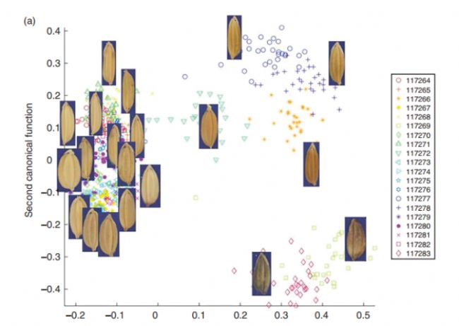 從每個BLOB中提取的177個特征集合被放入一個矩陣 X∈R598x177:其中一些特征與水稻種子在不同波長下的反射值有關(guān),一些是(線性)CDA 投影,用于區(qū)分和增強整個種子和形態(tài)的顏色差異。每個特征都通過對所有種質(zhì)的成對測試進行測試,并且沒有顯示出分離能力的特征被移除。這將特征數(shù)量減少到 90。由于與其他特征的高度相關(guān)性,另外50個特征被移除(r>0.99;P <0.05),產(chǎn)生一個矩陣 X∈R598x40。