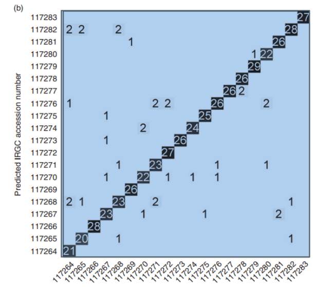 圖2.(a)前兩個 CDA 函數(shù)的散點圖,覆蓋了種質(zhì)的示例大米圖像?蛑酗@示的數(shù)字是國際水稻基因庫收藏(IRGC)登錄號。 (b)應用優(yōu)化模型后得到的誤差矩陣。沿對角線的陰影數(shù)字表示 BLOB(水稻種子)的數(shù)量被正確分配(預測類別 ¼ 真實類別)。其他數(shù)字顯示 BLOB 的數(shù)量分配不正確。正確分類種子的總比例為93%。