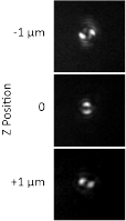 圖2:?jiǎn)蝹(gè)100nm珠在Prime95B上使用SPINDLE在焦平面(0µm)和焦平面上方(+1µm)和下方(-1µm)微米處的成像圖