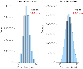 4:橫向和軸向精度。用于重建圖2所示圖像的定位精度值。精度值由3DTRAX軟件根據(jù)其信噪比使用每個(gè)發(fā)射器的Cramer-Rao下界5計(jì)算得出。定位數(shù)顯示在y軸上,精度值(nm)顯示在x軸上