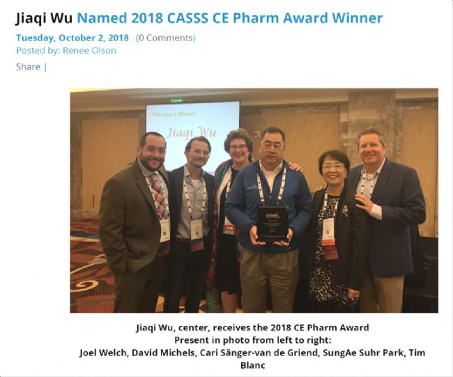 2018年CE Pharm年度大獎授予成像毛細管電泳技術(icIEF)發(fā)明人Dr. Jiaqi Wu,以獎勵其對毛細管電泳技術在生物制藥領域應用做出的貢獻。