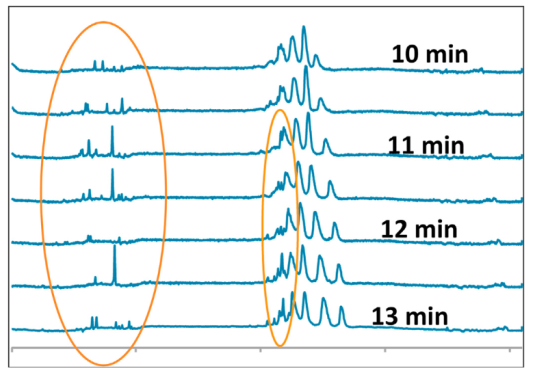 下圖使用icIEF聚焦時間誘導聚集例子來說明這一難題,當聚焦時間超過10min時,蛋白質聚集導致電泳圖開始出現尖峰。因此,當聚焦時間超過10分鐘時,峰型不穩(wěn)定,導致數據重復性較差。