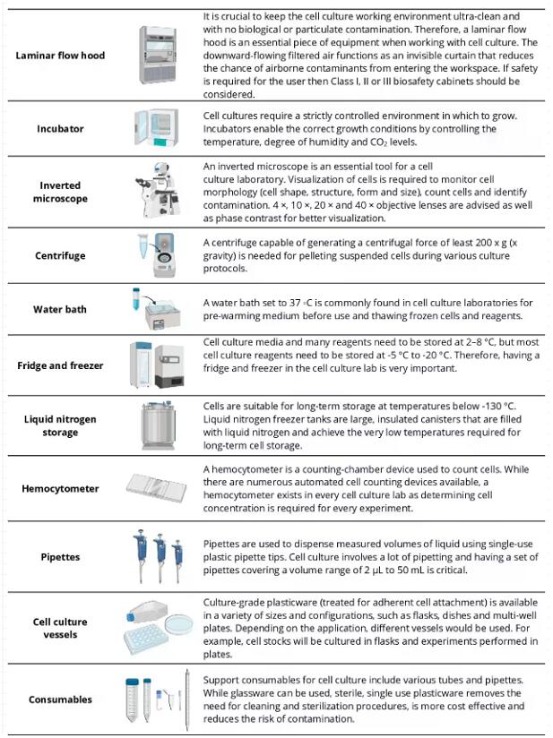 要進(jìn)行需要細(xì)胞培養(yǎng)工作的研究并進(jìn)行基本的細(xì)胞培養(yǎng)方案,下表1和表2匯總了一些關(guān)鍵設(shè)備和一些基本試劑。