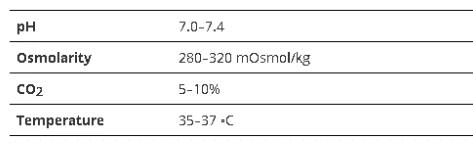 對于細(xì)胞存活和生長,至關(guān)重要的是培養(yǎng)環(huán)境盡可能復(fù)制細(xì)胞的生理環(huán)境?梢钥刂频呐囵B(yǎng)條件包括溫度、相對濕度和二氧化碳含量,以及與培養(yǎng)基相關(guān)的因素,例如營養(yǎng)成分、pH、分子滲透摩爾濃度以及補(bǔ)料的體積和使用頻率。這些變量會(huì)隨時(shí)間波動(dòng),因此應(yīng)對其 進(jìn)行監(jiān)視。下表3突出顯示了大多數(shù)哺乳動(dòng)物細(xì)胞培養(yǎng)的最佳培養(yǎng)條件,但有些細(xì)胞確實(shí)存在例外。