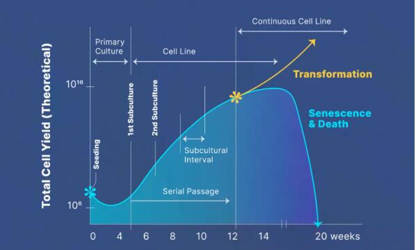 一些細(xì)胞系的壽命沒有限制,并且具有無限的增殖能力。這些細(xì)胞系被稱為連續(xù)的或永生的細(xì)胞系。細(xì)胞的永生化可以多種方式發(fā)生。癌細(xì)胞具有固有的突變,使細(xì)胞能夠不受限制地繁殖。最初具有有限壽命的正常細(xì)胞可以通過促進(jìn)生長的基因突變而轉(zhuǎn)化為永生化細(xì)胞。通過化學(xué)處理或引入可激活生長促進(jìn)基因的致瘤病毒,也可使在培養(yǎng)物中生長的正常細(xì)胞永生。下圖1顯示了從原代到轉(zhuǎn)化后連續(xù)細(xì)胞系的進(jìn)化以及每個(gè)階段的理論細(xì)胞產(chǎn)量。