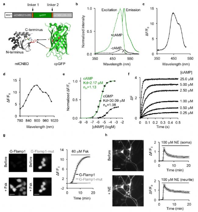 環(huán)磷酸腺苷(cAMP)是細胞內(nèi)關(guān)鍵第二信使,可整合來自多種G蛋白偶聯(lián)受體(GPCR)的信號,在學(xué)習(xí)與記憶、藥物成癮、運動控制、免疫、腫瘤、代謝等過程中發(fā)揮重要作用;罴毎突铙w水平的cAMP分子濃度變化的高時空分辨率熒光成像是解析cAMP信號通路及其生物學(xué)功能的重要基礎(chǔ)。因此,開發(fā)高靈敏的cAMP熒光探針成為研究復(fù)雜生物過程的關(guān)鍵。與非基因編碼探針(染料和材料類)相比,基因編碼探針具有低毒性、低背景、可遺傳、可定位特定細胞亞結(jié)構(gòu)或特定細胞等優(yōu)點,在生命科學(xué)基礎(chǔ)研究中具有無可比擬的優(yōu)勢。然而,現(xiàn)有的50多個基因編碼的cAMP熒光探針要么靈敏度低(熒光變化最大只有1.5倍),要么熒光亮度較暗,很難監(jiān)測活體中微弱的內(nèi)源性cAMP變化,極大地限制了生理和病理狀態(tài)下cAMP分子調(diào)控機理和功能的研究。2022年9月12日,中國科學(xué)院深圳先進技術(shù)研究院醫(yī)工所儲軍課題組在國際知名期刊Nature Communications上發(fā)表了題為“A high-performance genetically encoded fluorescent indicator for in vivo cAMP imaging”的最/新成果,展示了一種高性能基因編碼的cAMP熒光探針。在該工作中,研究人員利用基于晶體結(jié)構(gòu)介導(dǎo)的理性設(shè)計和蛋白質(zhì)定向進化技術(shù),開發(fā)了一種基于“環(huán)化重排熒光蛋白”(circularly permuted fluorescent protein)的高性能基因編碼的cAMP綠色熒光探針(命名為G-Flamp1)。在活細胞內(nèi),該探針在單光子和雙光子激發(fā)下的最大熒光變化均達到了12倍,并且結(jié)合和解離的時間達到了0.2和0.087秒。利用雙光子顯微鏡和光纖記錄儀,在果蠅和小鼠等模式生物內(nèi),該探針可實時監(jiān)測特定動物行為過程中特定神經(jīng)元的cAMP信號的時空動力學(xué)變化。