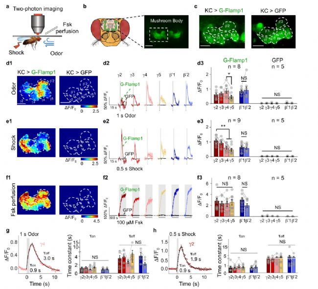 隨后,研究人員將G-Flamp1探針應(yīng)用于果蠅這一模式生物中。果蠅腦部蘑菇體(mushroom body)的Kenyon細胞中cAMP信號通路在氣味相關(guān)的記憶中發(fā)揮關(guān)鍵作用。作者首先獲取了Kenyon細胞中表達G-Flamp1探針的轉(zhuǎn)基因果蠅,然后利用雙光子進行成像,果蠅受到氣味或電擊刺激時,蘑菇體不同子區(qū)域呈現(xiàn)不一樣的cAMP信號時空變化(圖2),暗示不同子區(qū)域可能在聯(lián)想性學(xué)習(xí)中起著相對獨立的作用。