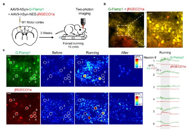 為驗證G-Flamp1探針在活體動物中檢測cAMP動態(tài)變化的實用性,研究人員利用腺相關(guān)病毒在小鼠運動皮層中共表達綠色G-Flamp1探針和紅色jRGECO1a鈣探針。活體雙光子成像揭示了跑步運動中細胞特異性的cAMP信號,其與鈣信號無明顯相關(guān)性(圖3)。這反映了小鼠運動時大腦皮層M1神經(jīng)元反應(yīng)的異質(zhì)性。