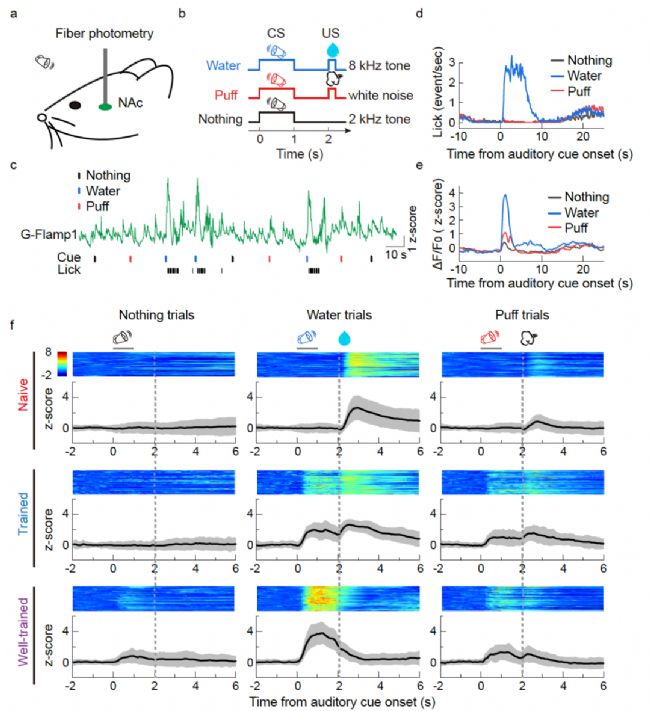 最后,研究人員在小鼠大腦深部的伏隔核(NAc)腦區(qū)中表達G-Flamp1探針,并利用光纖記錄聽覺巴甫洛夫條件反射任務(wù)中該腦區(qū)cAMP信號的變化。結(jié)果表明,隨著訓(xùn)練的熟練,小鼠得到獎賞時cAMP信號幅度在降低,而聽到相應(yīng)聲頻信號時cAMP信號幅度在升高(圖4);該特性與多巴胺信號類似,暗示多巴胺釋放引起了cAMP信號。綜上,G-Flamp1探針的高信噪比和高時間分辨率能夠高靈敏檢測到活體小鼠中內(nèi)源性cAMP信號的動態(tài)變化。