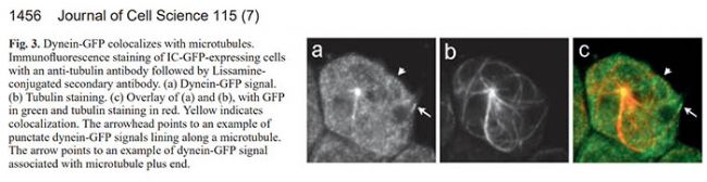 熒光顯微鏡下的細(xì)胞微管(紅)和動力蛋白(綠)②