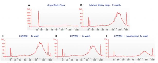- 通過對(duì)比生物分析儀的結(jié)果,可以看到C.WASH與手工清洗相比,在DNA純化方面達(dá)到了相同的清洗效果,并且C.WASH清洗速度更快(圖7)。
