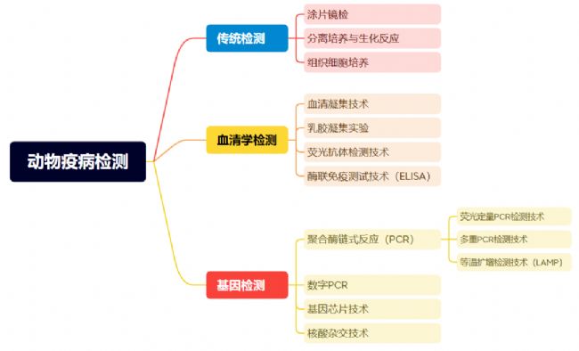 那么都有什么檢測方式可供我們選擇呢,下面一圖帶你了解現(xiàn)階段主流的動(dòng)物疫病檢測方法。