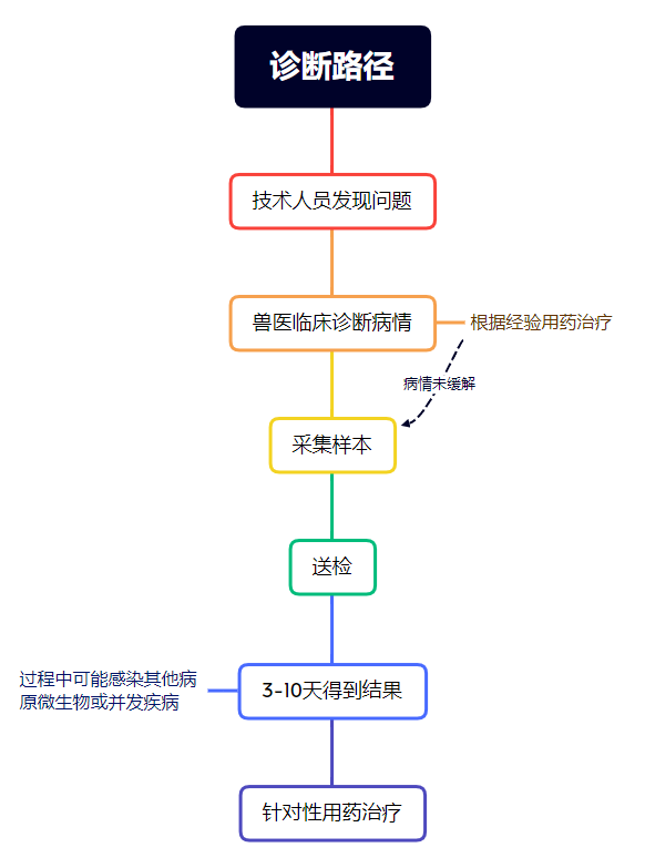 目前整個(gè)畜牧行業(yè)使用較多的還是傳統(tǒng)檢測和血清學(xué)檢測,診斷路徑為: