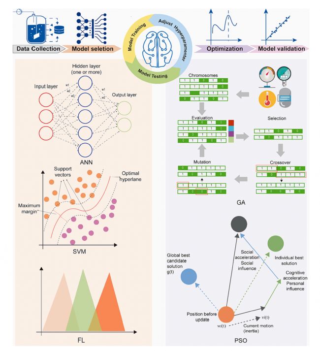圖 1. 生物過程建模和優(yōu)化程序以及人工神經(jīng)網(wǎng)絡(luò)(ANN)、支持向量機(jī)(SVM)、模糊邏輯 (FL)、遺傳算法(GA)和粒子群優(yōu)化(PSO)的示意圖