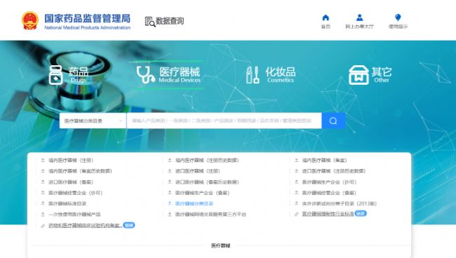 醫(yī)療器械分類查詢可以通過NMPA官網(wǎng)醫(yī)療器械欄-醫(yī)療器械查詢,網(wǎng)站如下:
