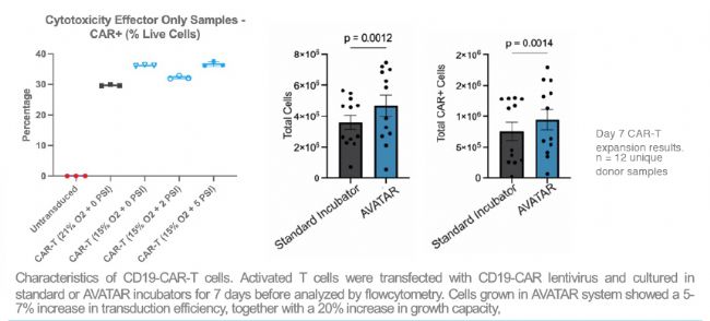 用CD19-CAR慢病毒轉染活化的T細胞,并在標準培養(yǎng)箱或AVTAR培養(yǎng)箱中培養(yǎng)7天,然后通過流式細胞術進行分析。在AVTAR系統(tǒng)中生長的細胞顯示出5-7%的轉導效率增加以及20%的生長能力增加。