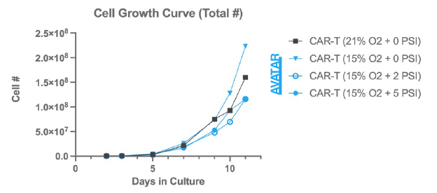 將相同數(shù)量的CD19-CAR-T細胞(5.0E+05)在不同的O2%和壓力條件下培養(yǎng)11天,并用AO/PI方法每天計數(shù)細胞數(shù)量。在培養(yǎng)期結束時,在低壓/缺氧條件下(CAR-T 15%O2+0 PSI)的AVATAR培養(yǎng)箱中的細胞具有最高的生長速率。