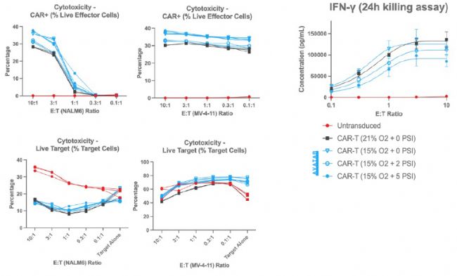 CAR-T細胞與靶細胞(NALM6或MV-4-11,5.0E+04/孔)以不同的E:T比共培養(yǎng)20h,然后通過流式細胞術分析細胞毒性,收集細胞上清液進行IFN-γ定量。與正常培養(yǎng)箱相比,在AVATAR培養(yǎng)箱中培養(yǎng)的CAR-T細胞具有更高的靶細胞殺傷能力,但在這些組中未檢測到IFN-γ分泌的變化。