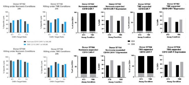 CD19 CAR-T細胞在Normoxic(21%O2+0PSI)或TME(AVTAR:1%O2+2PSI)培養(yǎng)條件下擴增。CD19 CAR-T細胞對NALM6的殺傷是在Normoxic或TME條件下進行的。與ST162供體來源的CD19 CAR-T細胞相比,ST164供體來源的CD19 CAR-T細胞顯示出10%的細胞毒性增加。供體來源的CAR -Ts在CD4/8人群中表現(xiàn)出顯著的變化,向CD4人群傾斜。有趣的是,更高的E:T比率并沒有導致更多的目標殺傷。