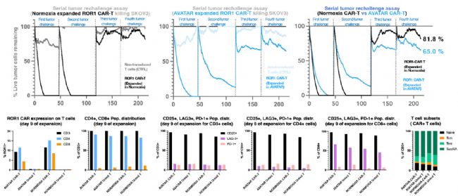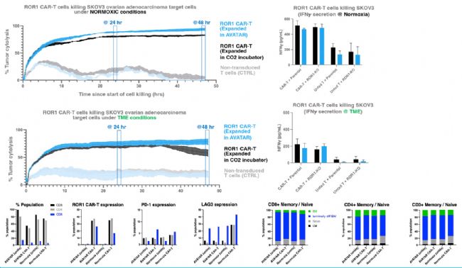腫瘤細胞溶解測定:將靶細胞SKOV3(ATCC)以每孔5K個細胞(96孔形式)接種。在效應細胞(ROR1 CAR-T細胞)以10∶1的效靶比(50K)引入之前,使靶細胞粘附24小時。在Normoxia(21%O2&0pSI)或TME(1%O2&2PSI)下進行細胞殺傷測定。在CO2培養(yǎng)箱或AVTAR系統(tǒng)(環(huán)境O2+4PSI)中轉導ROR1 CAR-T細胞并擴增9天。在共培養(yǎng)48小時后進行IFN-γ分泌測定(BD cat#555142)。使用BD Fortessa X-20對Naïve cells(CCR7+CD45RA+)、中央記憶(CCR7+CD45RA-)、效應記憶(CCF7-CD45RA-)進行流式細胞術檢測。