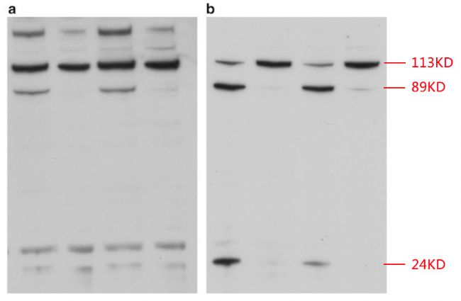 洗膜過(guò)程在4℃下進(jìn)行,可以避免特異性抗體-抗原結(jié)合的過(guò)度解離,同時(shí)有效減少非特異性結(jié)合,提高結(jié)果質(zhì)量。實(shí)驗(yàn)者采用透明細(xì)胞腎癌(ccRCC)細(xì)胞系的細(xì)胞提取物與兔多克隆抗PARP抗體進(jìn)行WB實(shí)驗(yàn)。在完全一致的電泳轉(zhuǎn)膜后,將a膜進(jìn)行手工封閉孵育和洗膜操作,一抗4℃下過(guò)夜孵育,其余步驟均在室溫下完成,b膜采用Blotcycler全程4℃下自動(dòng)化處理,其結(jié)果如圖2所示:采用手工程序處理的印跡膜,結(jié)果檢測(cè)到多個(gè)非特異性條帶,見(jiàn)圖2a;而B(niǎo)lotcycler全程4℃下自動(dòng)化處理的印跡膜,僅檢測(cè)到未切割的PARP蛋白(113kD)以及C端和N端切割的PARP片段(分別為89kD和24kD)的條帶,見(jiàn)圖2b(數(shù)據(jù)來(lái)自Precision Biosystems)。